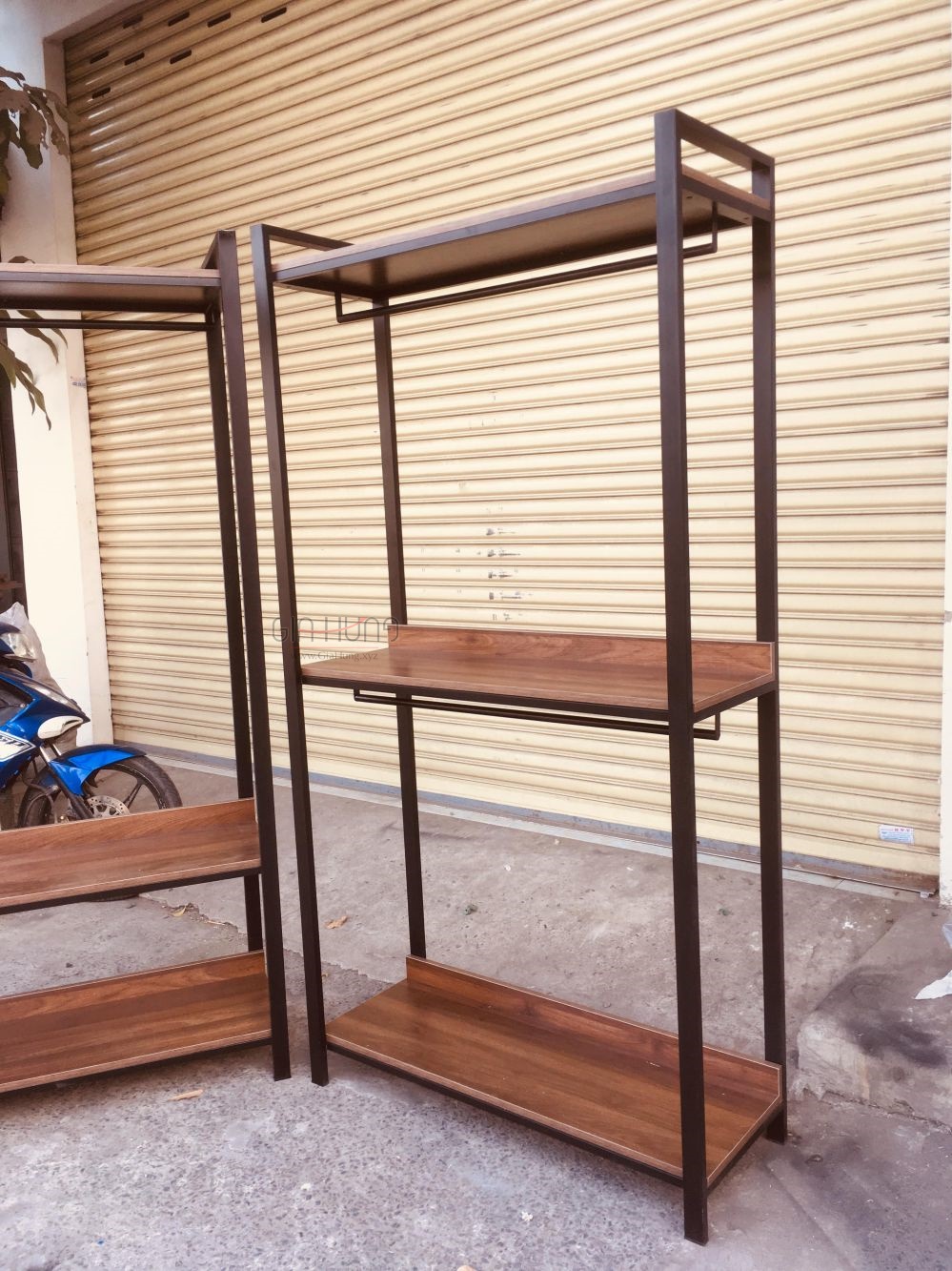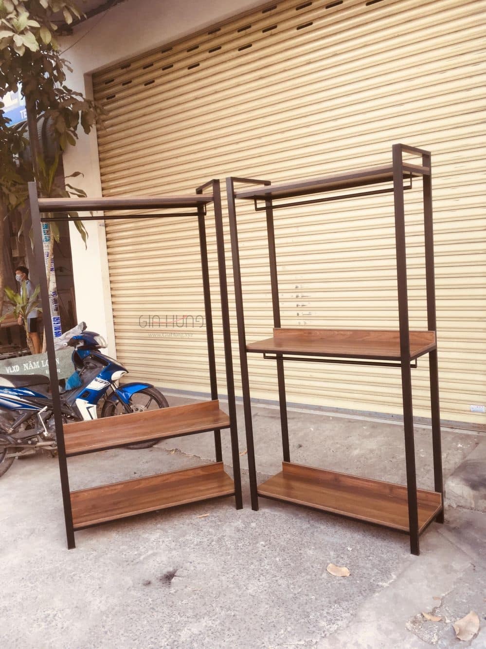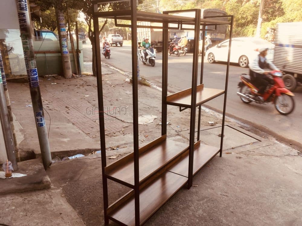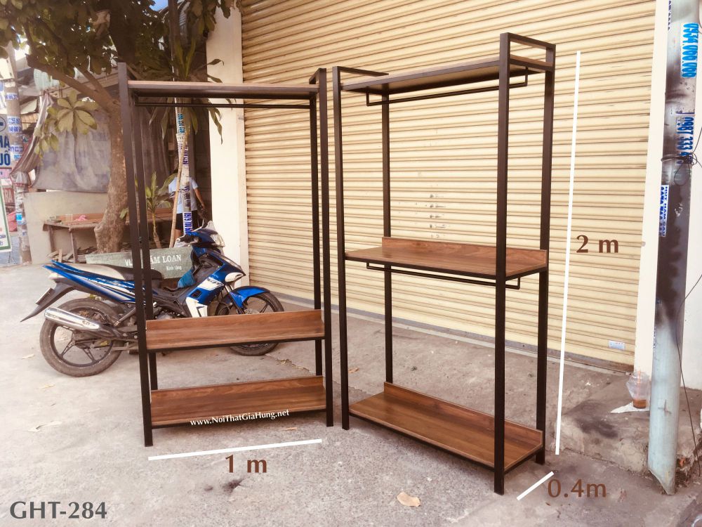 Bộ 2 kệ treo quần áo khung chân sắt mặt gỗ GHT-284 được bảo hành 2 năm.